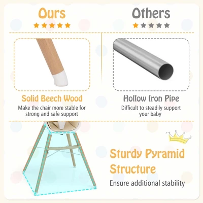 - Stable Wood Support: The baby high chair is firmly supported by 4 solid beech wood feet with sturdy X-shaped structure. And the non-slip foot pads effectively avoid the floor from scratches.