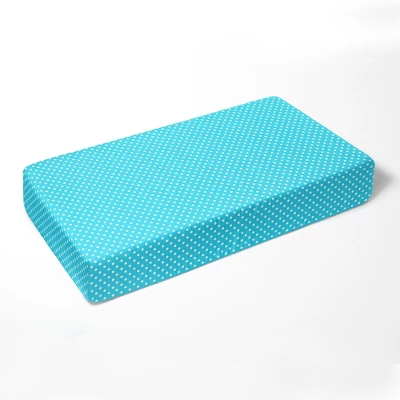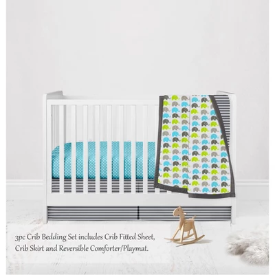 - This Bacati 3-piece Crib Set Includes Reversible Comforter/Playmat (33 x 43 inches), Crib fitted sheet (52 x 28 x 6 inches) and Crib Skirt/Dust ruffle (13 inch drop) in fun, colorful and signature prints in 100 percent cotton 200 Thread Count percale fabrics. Designed in United States by Experienced Designers. Many coordinating items available to purchase separately in this Bacati Elephants Aqua/Lime/Gray Bedding Collection.