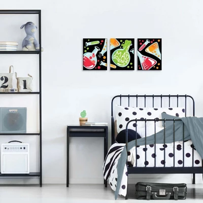 Scientist Lab Wall Art Set INCLUDES 3 ready-to-hang science themed panels and non-marking wall mounts for easy hanging. Scientist Lab artwork is perfect for a nursery, kids room or playroom. Scientist Lab Wall Art & Kids Room Decor SIZE each 10 inches high x 7.5 inches wide x .5 inches thick. Mad science lightweight art prints will arrive ready to use – no frame needed. The black edge gives each print a modern, finished look. EASY TO HANG: Simply attach a non-marking wall mount (included) to each corner of a Scientist Lab art panel and press to hang in desired location. Wall mounts are repositionable, so you can redesign your artwork display at any time. PREMIUM HOME DECOR: 3-piece Scientist Lab Wall Art Set is professionally printed on thick material with a black edge. You will not need to frame this set of science lab room decor. Each standout print is ready to hang and will add a contemporary touch to any room. MADE IN THE USA: Scientist Lab Mountain Nursery Wall Art & Kids Room Decor is designed and manufactured at our Wisconsin facility using materials that are Made in the USA.