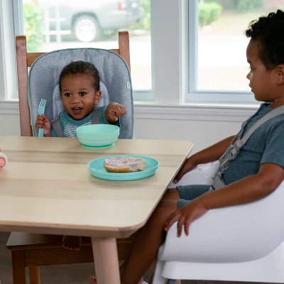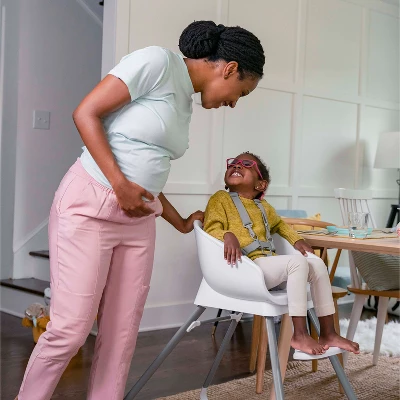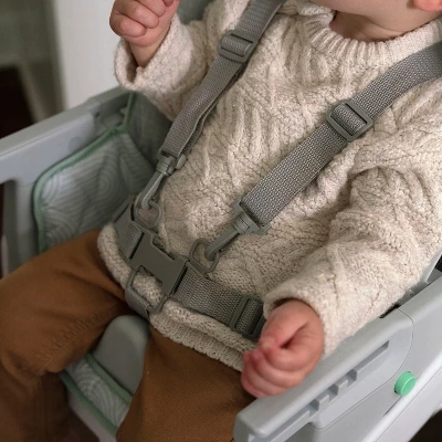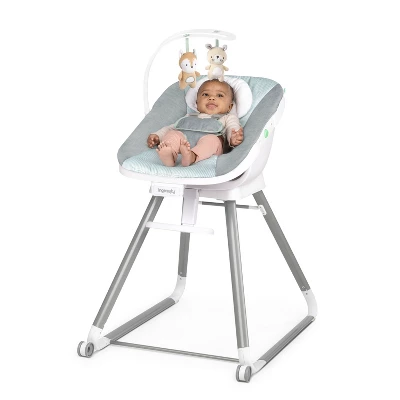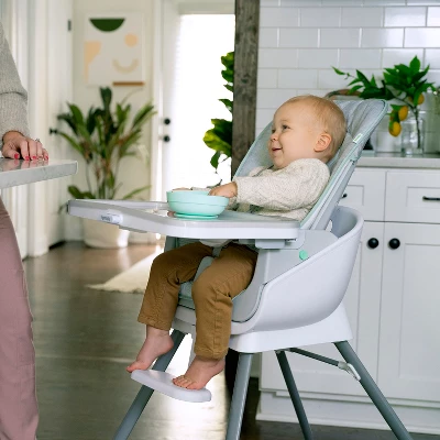 From day one, your little sprout can have a comfy seat at the dinner table with this convertible high chair. The Ingenuity Beanstalk Baby to Big Kid 6-in-1 High Chair offers 6 grow-with-me modes from newborn up to 5 years of age, including a soothing infant seat specifically designed for newborns. The other modes include a full size high chair with a tray; an infant dining chair that allows baby to join the family at the table without the tray; a chair top high chair; a toddler chair; and two ways to seat two kids. Extra comfy seat padding creates cozy feeding spot for baby. The Beanstalk has two front wheels and is easy to maneuver with one hand when you’ve got a baby on your hip. The tray is removable and adjusts to 3 different locking positions to keep baby more secure. An adjustable 5-point harness keeps baby tucked in for every mode. Infant seat mode features a toy bar and gentle vibrations to keep baby soothed while you cook. As baby grows, the footrest adjusts to baby’s height in high chair and toddler chair modes. Mealtime messes are no big deal—with a wipeable seat pad and a BPA-free, dishwasher-safe tray, your Beanstalk will be tidy in a jiffy (but your little sprout might need a bath).