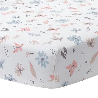 Your little one will drift off to dreamland surrounded by this lovely watercolor floral nursery bedding collection. The three-piece baby bedding crib set includes one quilt, one breathable 100% cotton fitted crib sheet, and one crib skirt. Designed in soft shades of robin egg blue, blush, light pink, warm taupe, and soft gray on a light cream-colored ground. The quilt and crib skirt have a pretty pink pom pom trim. The breathable 100% cotton fitted crib sheet features pretty butterflies, spring flowers, mushrooms, and leaves. The fitted crib sheet has elastic all the way around ensuring a safe and secure fit on a standard sized crib mattress measuring 28” X 52”. The crib skirt adds the finishing touch to your child’s crib. It is made in pink linen viscose and is 14 ½” long. It has split corners for easy placement. All items are machine washable for easy care.