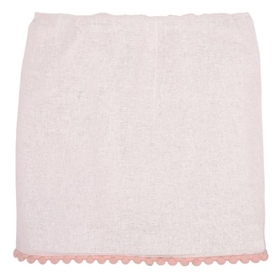 - Pretty pom pom trim decorates the linen quilt and crib skirt