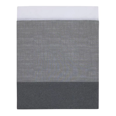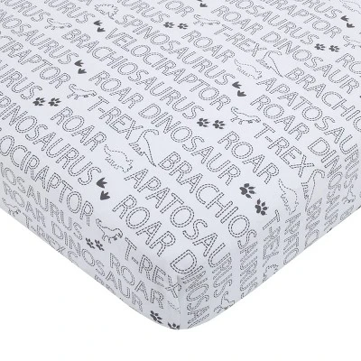 This NoJo Baby-Saurus 4 Piece Nursery Crib Bedding Set includes a comforter, 100% cotton fitted crib sheet, crib skirt, and storage! The comforter has four dinosaur appliques amongst a patchwork of gray heather and striped backgrounds and green mountains! Two dinosaurs have a super soft body and a basket weave jacquard belly. The other two feature a herringbone chambray quality. The border has a flannel like charcoal trim. Reverses to a fun and modern dotted word print of different dinosaurs! Measures 36″ x 45″. The coordinating fitted crib sheet is 100% cotton and features elastic around the edges for a safe and snug fit. Fits a standard size crib/toddler mattress that measures 28″ x 52″. The crib skirt is a light solid gray with a dark gray trim and has a 14″ drop. The tie storage organizer has an all over word print and a black chambray and woven textured fabric for the inside. Reversible.