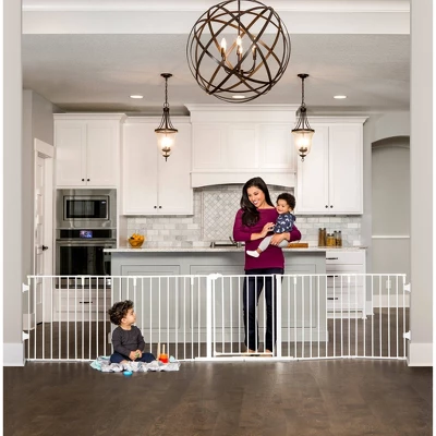 This play yard and baby gate features durable all-steel components and a hardware-mount system ideal for large, angled, or uneven openings. The super wide gate is equipped with 6 panels and can be expanded to fit openings up to 130”. The panels connect to hinged posts that offer an amazing variety of shaping possibilities.