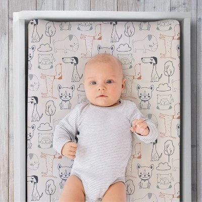 Playful pooches are sweetly illustrated in multiple colors on a warm ivory ground in this Pug Life Changing Pad Cover from The Peanutshell. Cotton is soft on baby’s tender skin. Pretty and playful on its own, but even better when combined with the Pug Life Blanket, this is the perfect layer between your little one and a changing pad. All around elastic provides stay-true hold and easy removal.