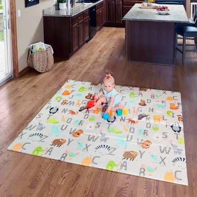 Keep your baby safe and happy with this Toddleroo by North States® Superyard® Folding ABC Play Mat. It’s made of PE foam, is hypoallergenic, non-toxic and BPA free. Acting as a padded cushion on the floor, it creates a delightful place for lying, crawling, rolling, tumbling, or just playing. The alphabet letters and animal friends on this mat will spark your baby’s imagination. Watch as they practice their growling noises with the cute animals and sing sweetly as they learn the ABCs. This mat is an extra large 71″ x 71″ square play area, the perfect size to fit under all Superyard Play Yards! Want to take it to the park or to Grandma’s house? No problem! Our indoor, outdoor play mat is ideal for any room, on carpet or hardwood, grass and playdates at any location. It conveniently folds into a compact size (18.1″ x 23.6″ x 6.3″), comes with its own carry case for easy transport and storage, plus it’s water resistant and only weighs 2.75 lbs. To clean, simply wipe with a soft, damp cloth, let dry and store. From every stage beginning with tummy time, you’ll meet your baby’s developing needs and enjoy hours of fun with this adorable Superyard Folding ABC Play Mat.